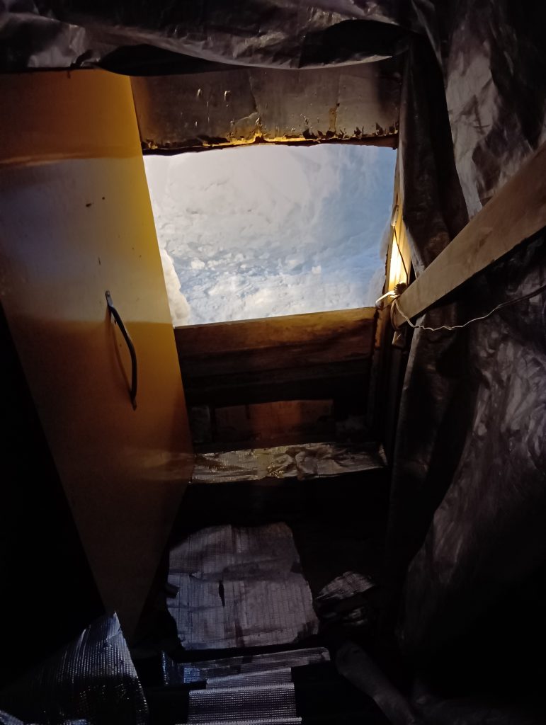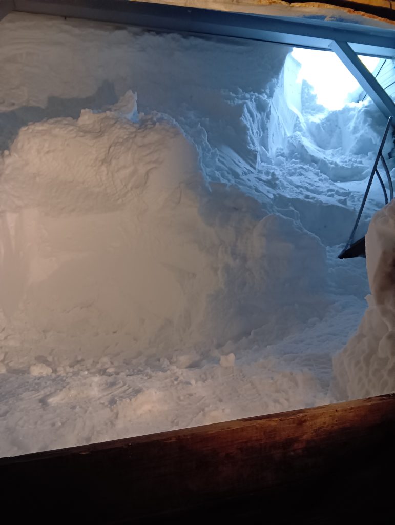 一日に1m規模の降積雪が有る日が続くと、屋根への雪室の入り口が、雪で塞がってしまい、大屋根の先と落下した雪の塊がくっ付いてしまいます。これを解消しながら、雪室の室内に潜り込み、ここで雪を処理しながらアソビマス。いま、次の写真の様な雪室内部と雪洞づくりになっています。
