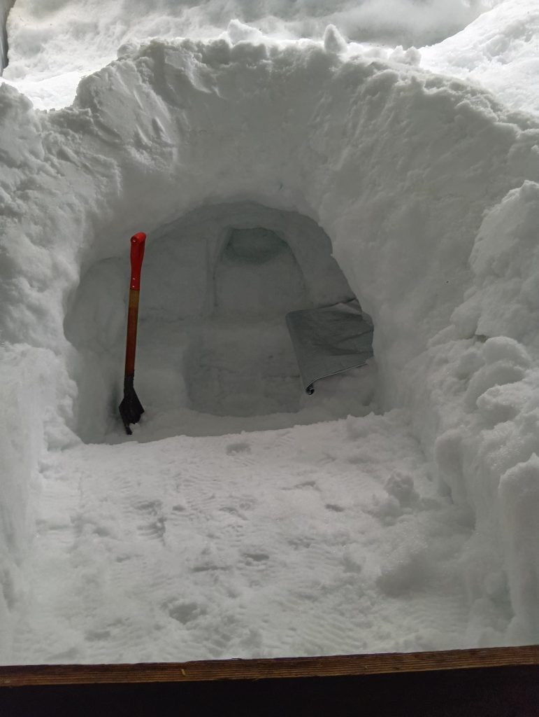 我が家の雪室も様変わり。今月の雪との交流、雪の手入れが始まりました。まず、雪洞のメンテ、今冬最後の室内雪遊び!?です。