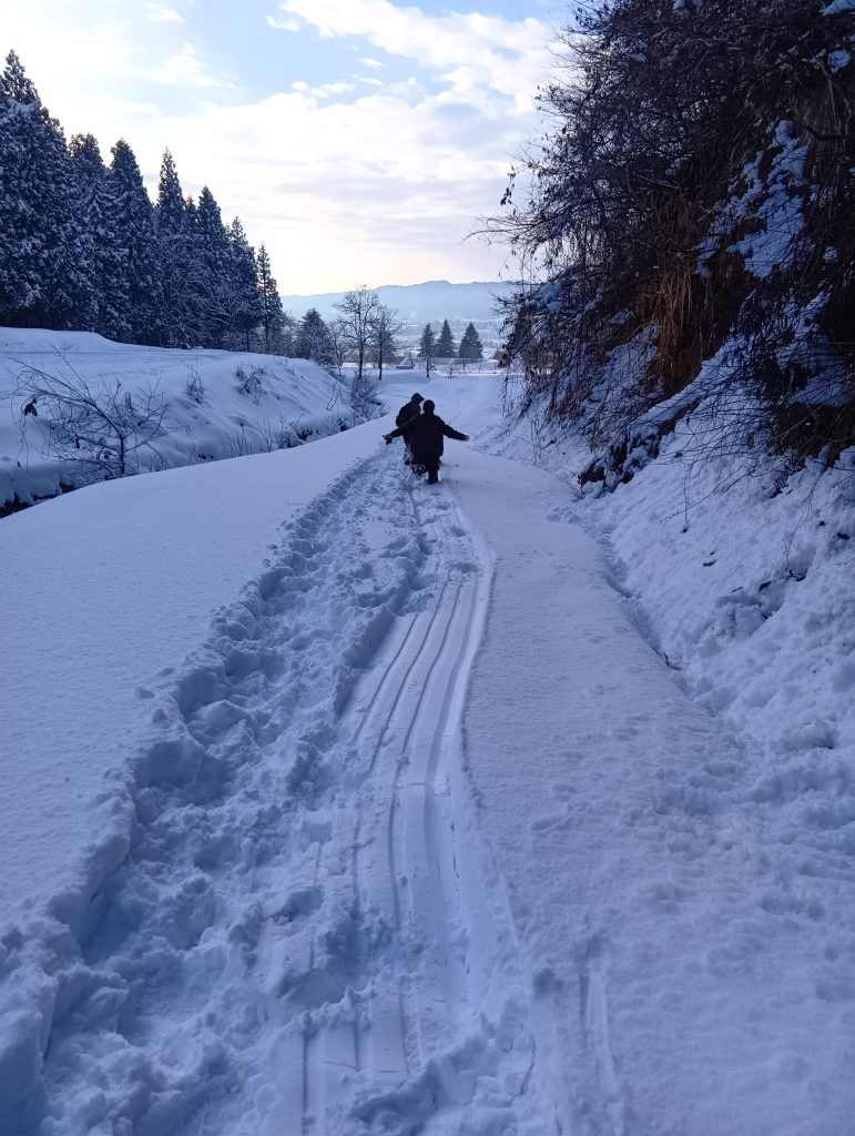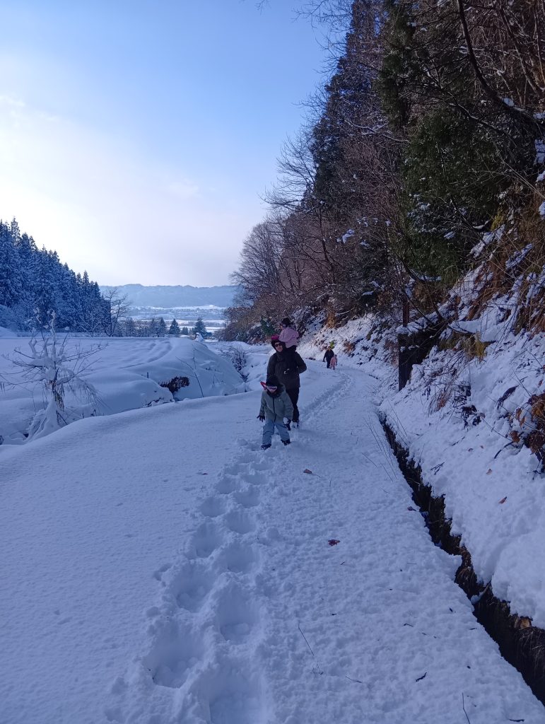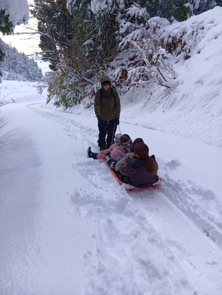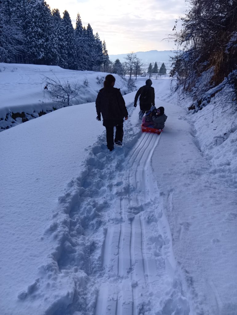 午後は、我が家から900m離れた山小屋へ。最初の400mは、除雪道路区間であり、笹山縄文広場駐車場まで車で行き、そこから500mは歩き。積雪20~30数cmの新雪道路を雪原「みちくさ」ハイク。「ようやく」山小屋に着き、囲炉裏で火を焚き、温めたお湯と自家「山小屋隣り」取り茗荷の天然塩漬けをいただきました。帰路は、山小屋備え付けの大ソリを一家5人で!父が引き、母が後ろに乗り、真ん中の子供達3人を束ね抱えて、雪道「トレール」となりました。いい!!全心身運動と本当に楽しい!またとない!娯楽体験でした。 ありがとうございます。(*^_^*)