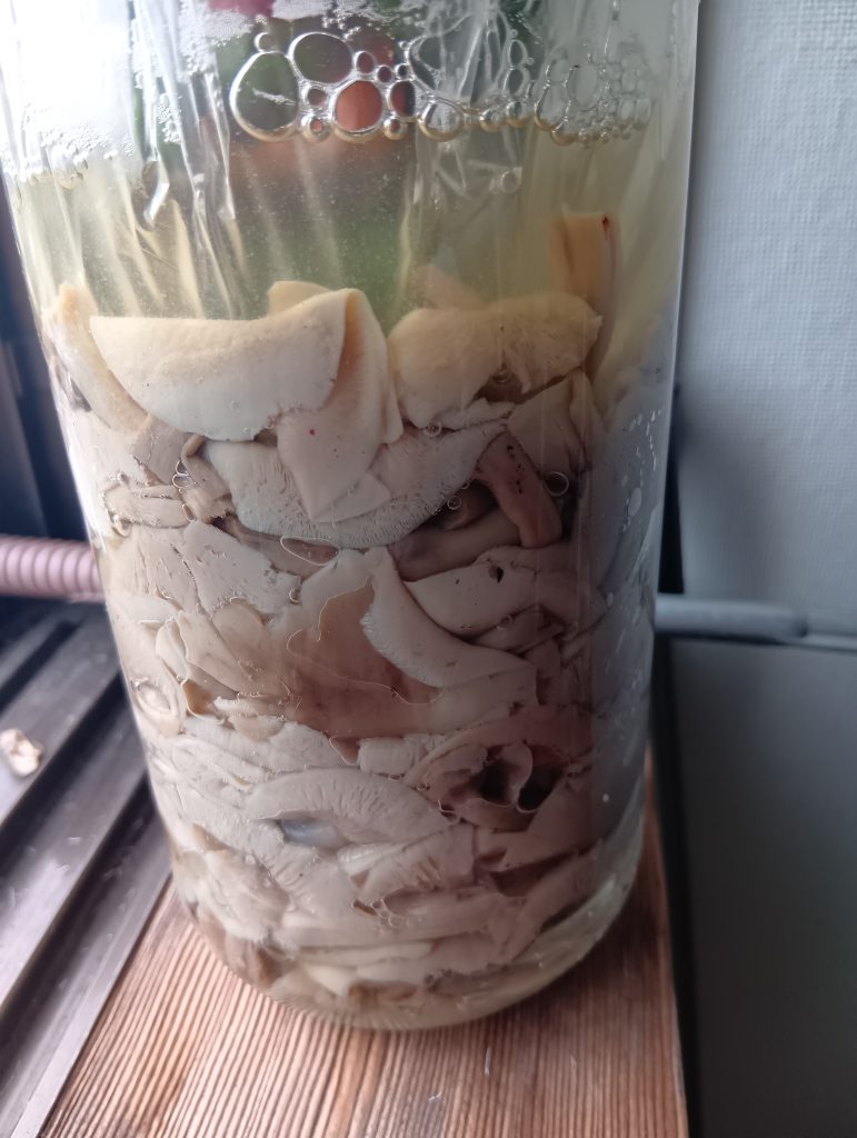 自然塩(お天道様だけで結晶した!ビタミンミネラル19%含有の100%天日塩。自家にて私が20年程!歯磨きから料理にまで使い続けている比国産雪国保存の10年以上物の天日塩)漬けて「一晩」経過。量は五分の一!?になり、質は特上?特醸!発酵品へ。