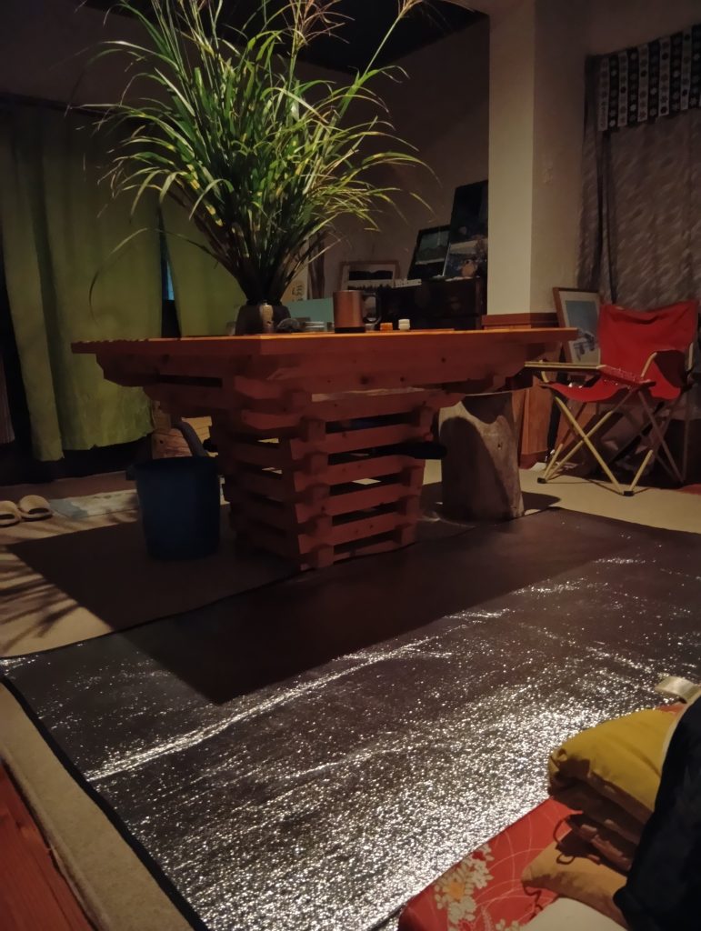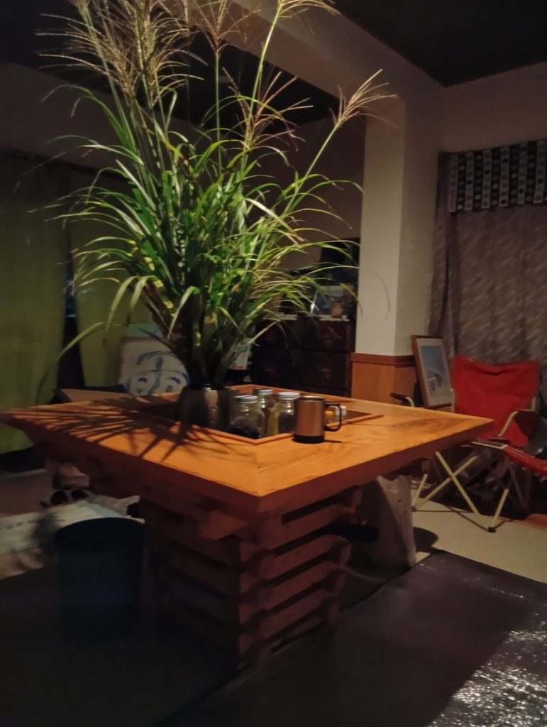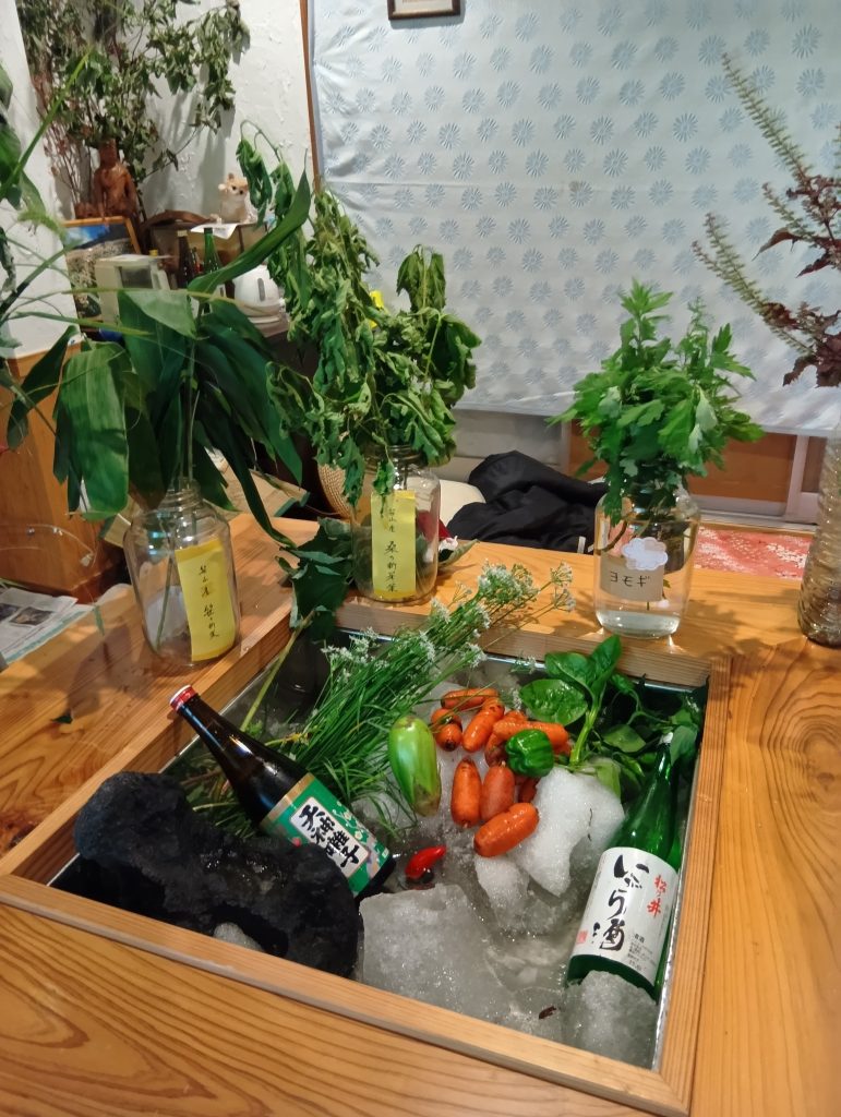 雪室の最期を晒し、現場を公開しながら、隣りの「雪カフェ」にて『雪の囲炉裏いろり』を試行。季節の草花と地元名産品を飾り、アジワイながらの、会話飲食お楽しみ会。一期一会のぶっつけ本番。快感!感謝です。