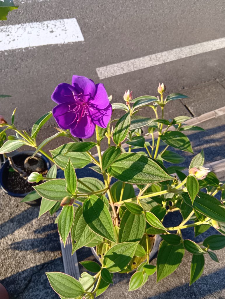 6時半過ぎ・・・朝から「いい」天気。昨日玄関の中から外に出した紫のつぼみを見に行きました。一輪開花確認、嬉しく和子さんに報告、そして水やり。