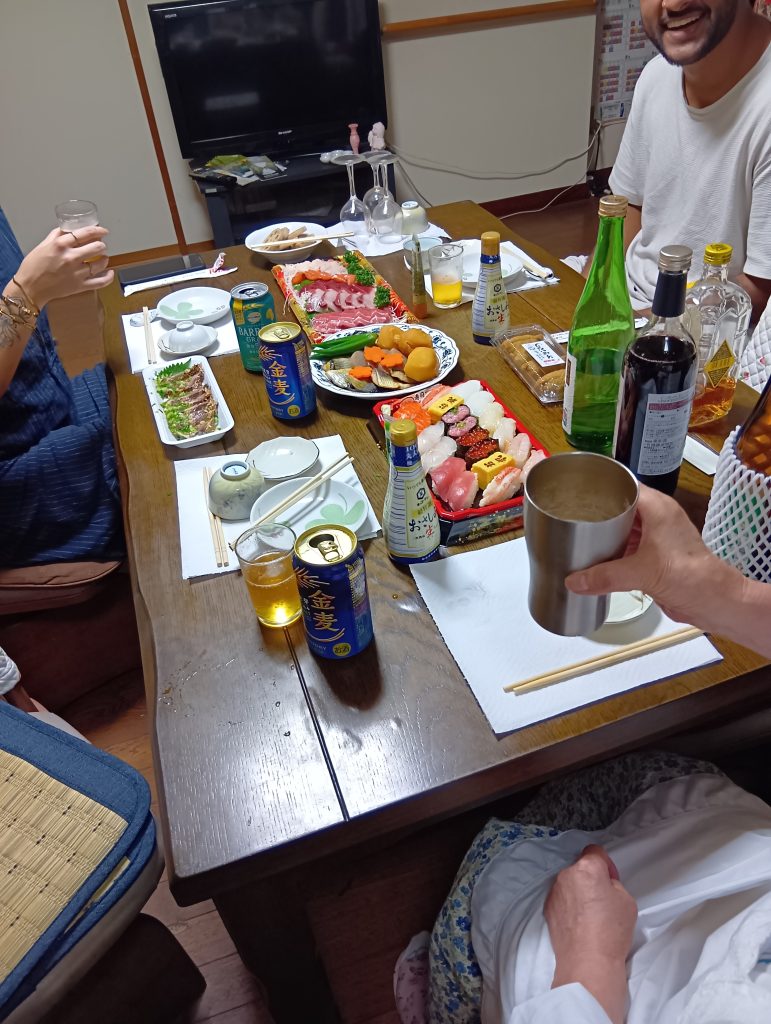 そして、最期の晩餐。ホストとゲストが、一緒に!地元のスーパーマーケットに行き、メニューを話し合いながら品選びし買い求めます。宿に帰り、和子さんの手料理と共に、楽しく配置し、向き合って!いざ!!乾杯 ( ^_^)/□☆□\(^_^ )(チアーズ・カンペイ)